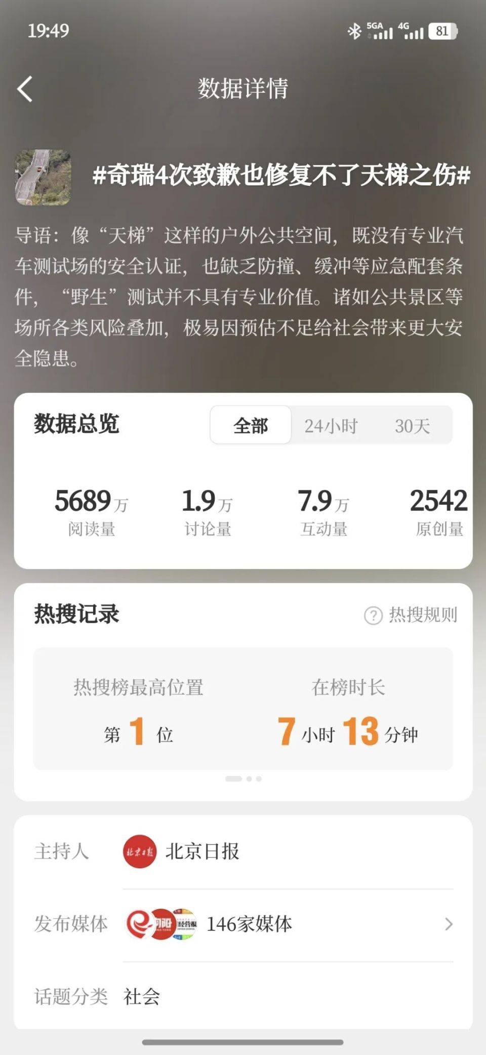 事故发生后,在网上迅速发酵,很多媒体、评论从车辆、奇瑞内部管理、社会公德等各个方面,对这件事展开评论。某社媒平台,媒体的参与量达到了146家,也就是说,146家各地媒体,集中“围攻”了奇瑞汽车。