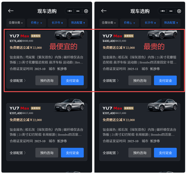 我所在的城市,最便宜的YU7价格是40.04万,优惠完后还要37.84万。最贵的是42.24万,优惠完后还要40.04万。
