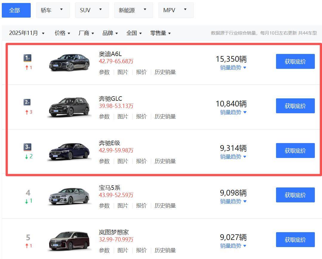 不过,当时间来到2025年10月份,情况就变了。10月份,BBA重回50万级别的前三名。而11月份,BBA则更是拿下了50万及以上销量榜的前4名,让不少人直呼“风向变了”。