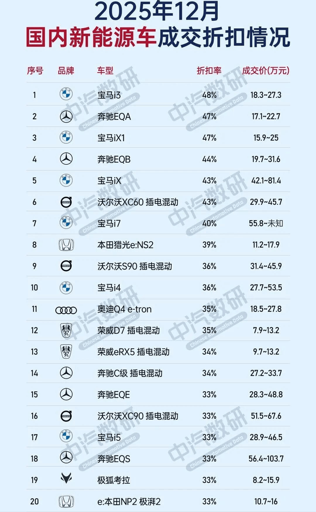 如上图,这是中汽数研发布的2025年12月份,国内新能源汽车折扣情况排名的前20名。
