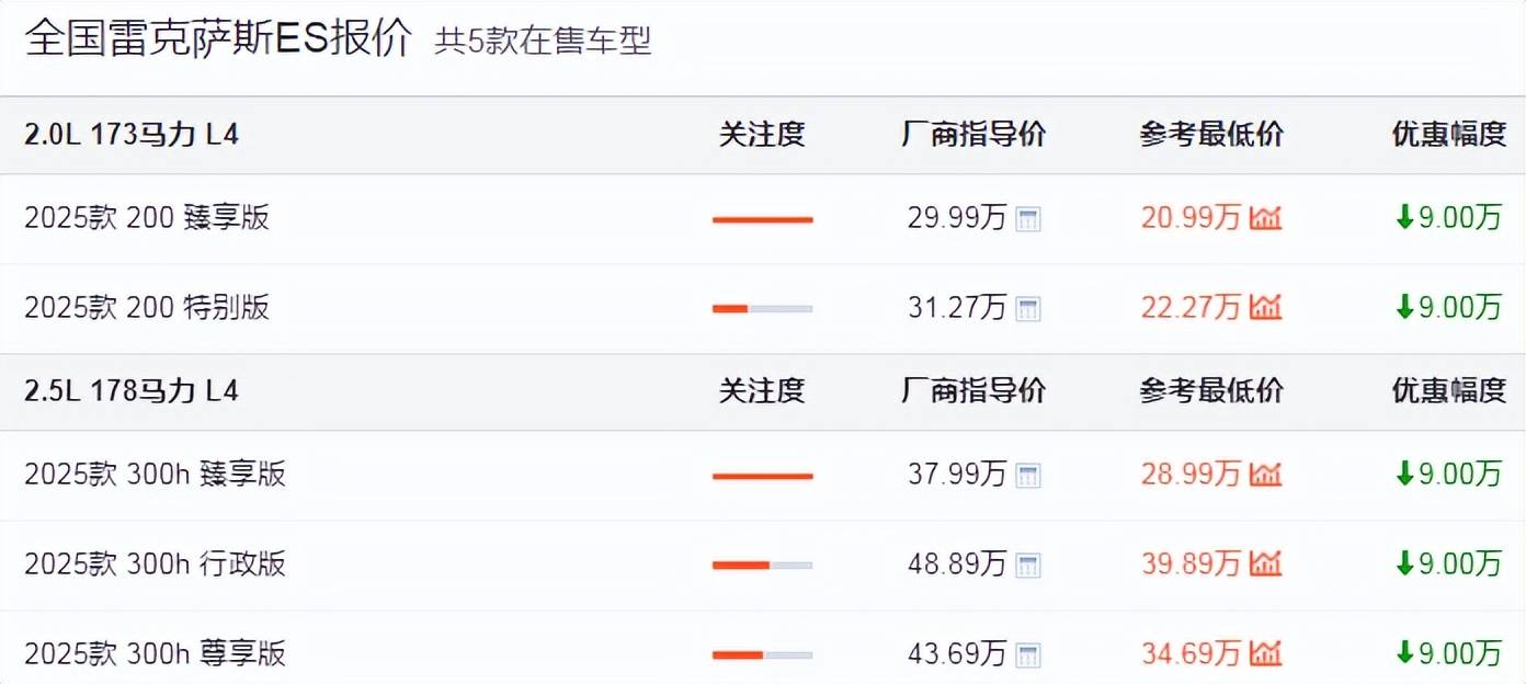可面对着日益激烈的竞争和消费者选择权的扩大,这套打法肯定是难以为继的。所以我们看到,雷克萨斯放下了身段,终端市场价格体系变得更为灵活,优惠力度显著增加。目前全国共有5款雷克萨斯ES在售,裸车参考最低价跌至20万元,和以前的加价场面完全是“天壤之别”了,这种降价力度自然也吸引了不少潜在消费者。