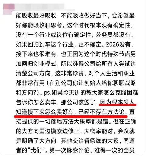 “能吸收最好吸收,不能吸收做好当下,但希望最好都能吸收和思考。这个时代根本没有确定性,没有一个行业或岗位有确定性。如果回归到车这个行业,更不确定。2026没有,接下来也很难有,也正因为这个时代特殊节点另加回归创业模式,所以难得公司给所有人尝试讲清楚公司方向,这非常珍贵,对个人生活和职业都非常有用。”