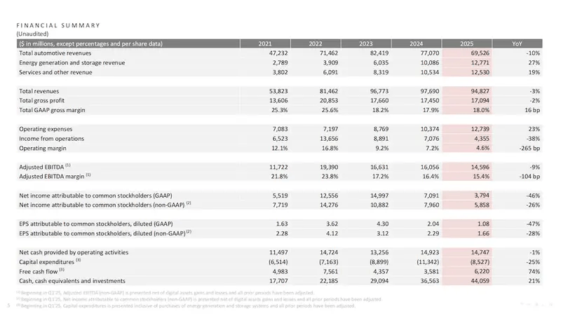 无独有偶,2026年1月29日,特斯拉交出了一份近年来的最差财报。2025财年营收948亿美元,同比下滑3%,这是特斯拉五年来首次出现年度营收下滑。