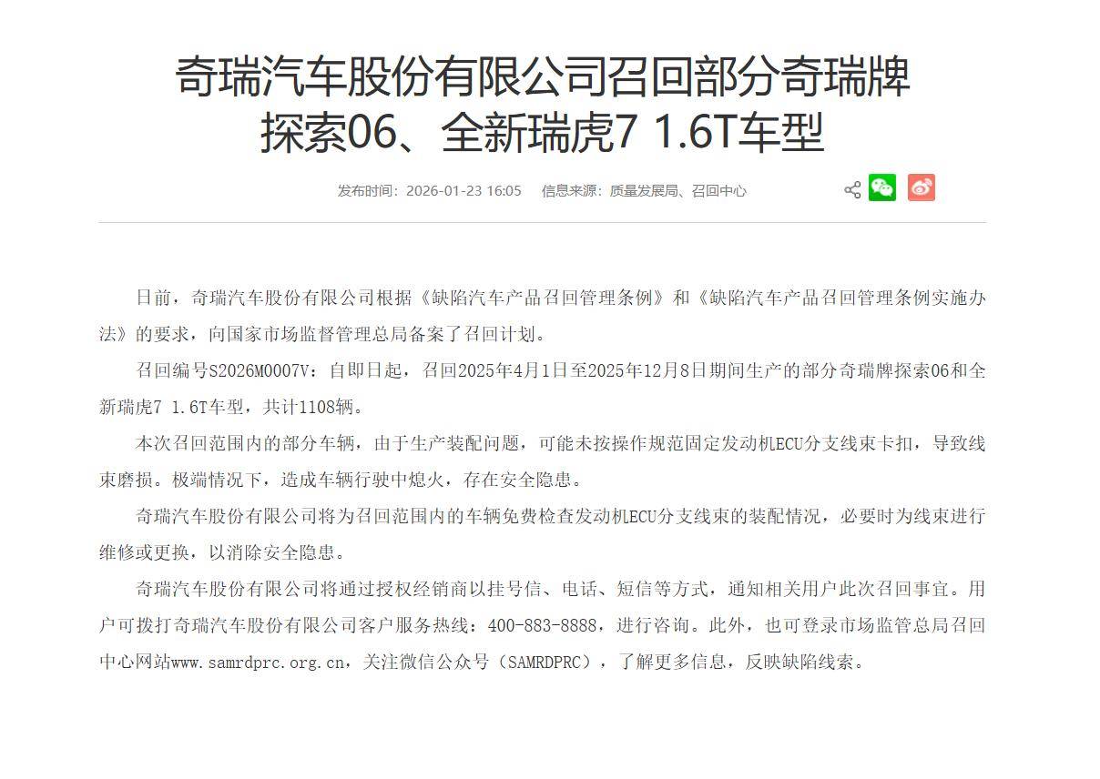 而近期奇瑞汽车也根据相关规定对旗下2025年4月1日至2025年12月8日期间生产的部分奇瑞牌探索06和全新瑞虎7 1.6T车型进行了召回,召回车型共计1108辆。召回原因则为由于生产装配问题,可能未按操作规范固定发动机ECU分支线束卡扣,导致线束磨损。极端情况下,造成车辆行驶中熄火,存在安全隐患。