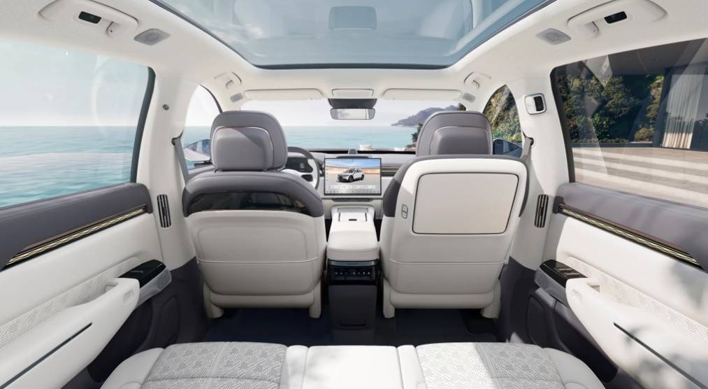 车内搭载 16 英寸大尺寸 OLED 中控娱乐屏和 36 英寸增强现实抬头显示系统(AR-HUD),强化高端品牌定位。为后排乘客打造的 13 英寸 2.5K OLED 娱乐屏布置于前排座椅靠背,全车座椅均采用带加热、通风及按摩功能的纳帕真皮座椅。