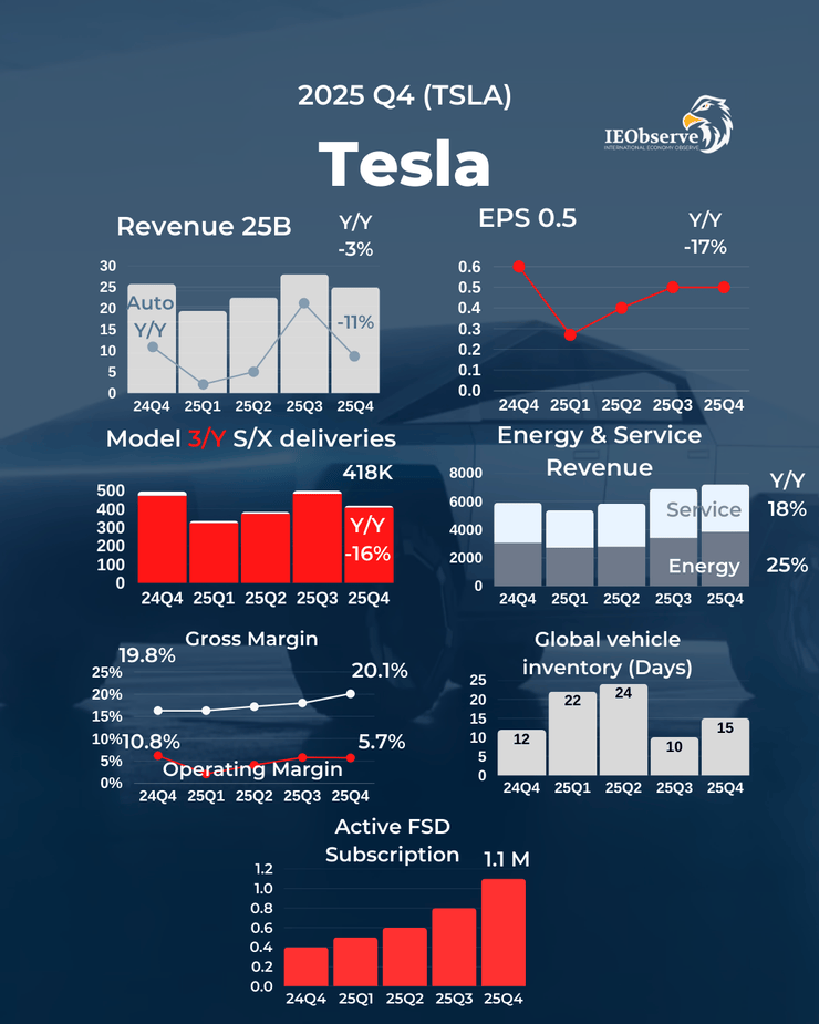 根据特斯拉公布的财报显示,2025年的营收为948.27亿美元,同比下降3%,其中汽车业务收入695.26亿美元,同比下降10%。