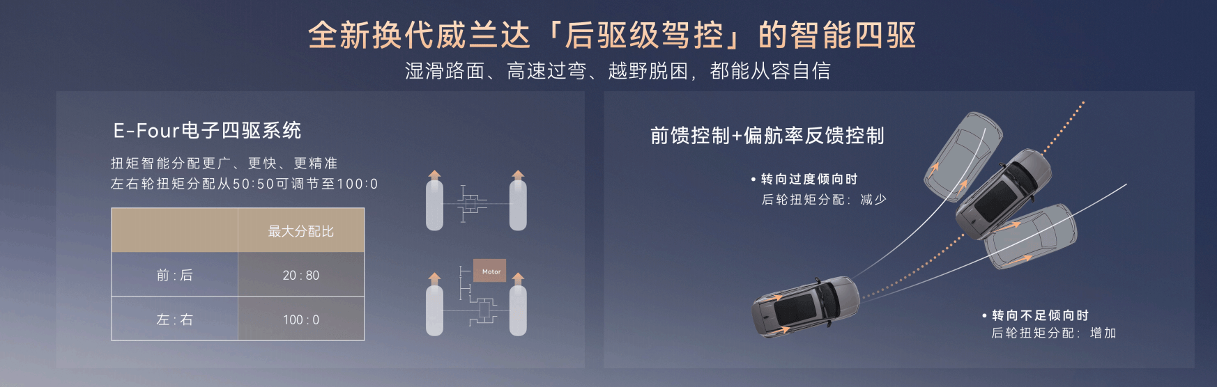 当所有油车发布都在大肆说智能化的当下,换代威兰达重新把少数人提及的机械素质摆上桌面。全新威兰达E-FOUR电子四驱可以罕见实现前后轴驱动力100:0-20:80的智能调节,动力系统通过对四驱系统和悬挂的智能调控,让这台城市SUV在保持舒适的同时,具备了超越同级的操控稳定性和通过性,过弯更灵活、脱困更迅速。应用全新ECB电子控制制动系统,轮上扭矩分配更快更精准,大幅优化侧倾控制,实现了更线性跟脚的制动脚感,显著缩短制动距离,过弯更稳。