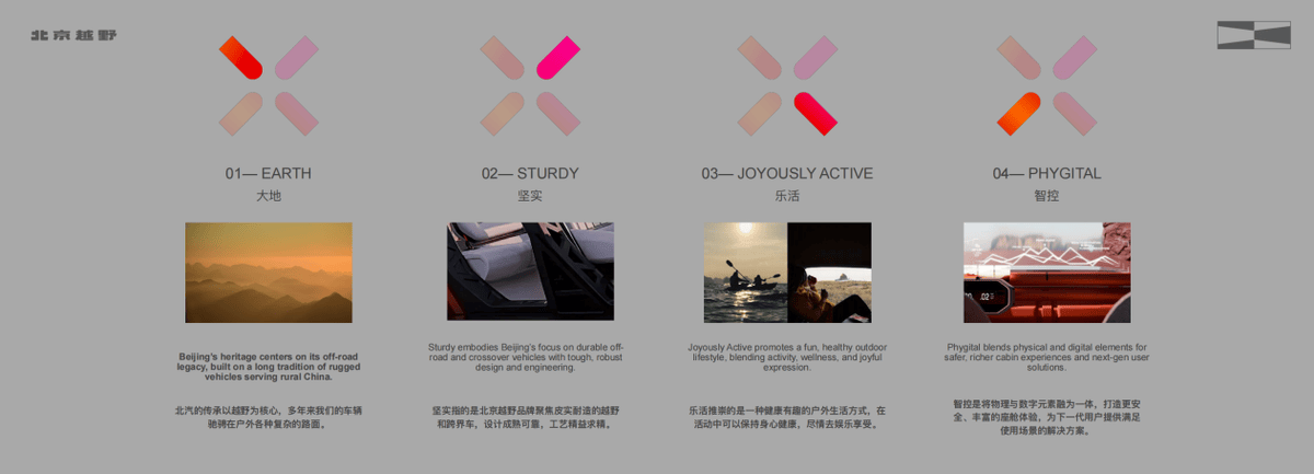 北京越野全新的设计理念命名为“ELEMENTAL”(元素化),建立在四大核心支柱之上,分别是:大地Earth、坚实Sturdy、乐活Joyously Active与智控Phygital。它是一个战略框架,既契合品牌特质,也贴合客户关注的核心——探险、健康与户外生活。从现在起,北京越野将创造性地、持续地将这一理念应用于全系车型。